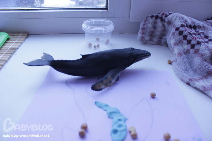 Развиваем наши пальчики. Рисунок кита выкладывали пластилином, а сверху выкладывали нут и вдавливали его.