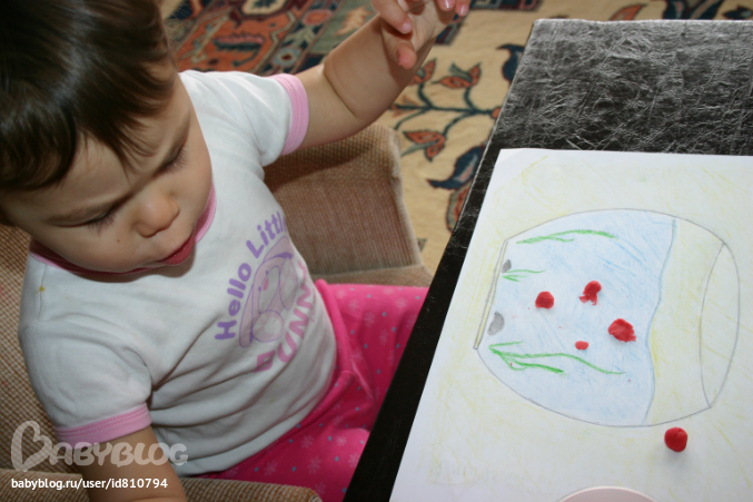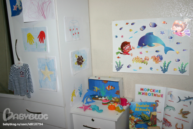 Тут и наши творческие работы,книги,тельняшка даже нашлась в гардеробе,картина,сделаннаянами из наклеек.Вот такой аквариум появился у нас.Тут про него http://www.babyblog.ru/community/post/igraem/1711779