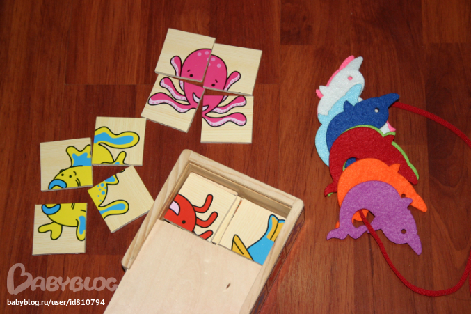 Дельфины из фетра.Считали их,цвета вспоминали.Пробовали одевать на шнурок,но слабо пока получается.