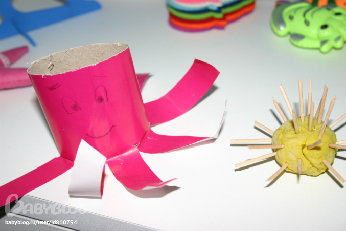 Осьминог из туалетного рулончика и цветной бумаги.Уже слегка потрепан. Морской еж из теста и зубочисток.