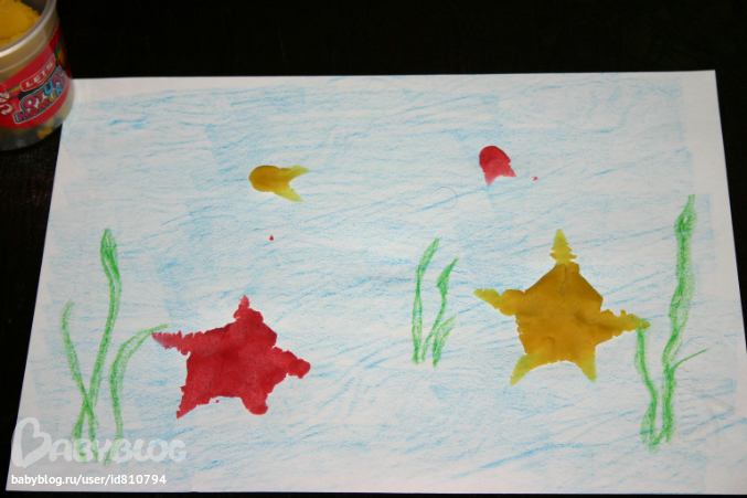 В море у нас рыбки и звезды из теста.Размазывали пальчиками.