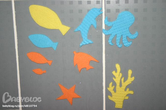 В ванне играли вот с такими морскими обитателями.Из кухонной салфетки вырезала фигурки.Они отлично лепятся на кафель или ванну. Вспоминали цвета,учили большой-маленький.