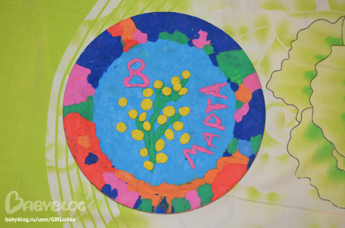 Мистер Умелец или Очумелые ручки (поделки, аппликации, интересные находки, идеи и задумки)В понедельник, поняв, что на 8 марта в садик мы не попадаем, на скорую руку соорудили с Андреем в подарок воспитательнице вот такую платилиновую картинку на бумажной тарелке