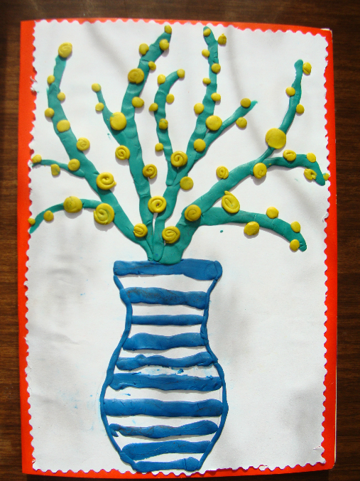 Эта открытка из пластилина, я нарисовала карандашом контур . Колбаски катать не очень у Саши получилось, зато резать их очень даже увлекательно было))). В Вазе я сделала только 3 полоски, остальное сам, я только потом подкорректировала по краям). Ветки уже 50 на 50 лепили, а точки (крупные должны быть как улитки) почти все я...Зато помогал мне обрезать края фигурными ножницами, что заметно))) . Как могла пыталась исправить...приклеяли на красный картон.