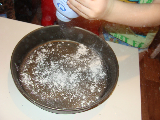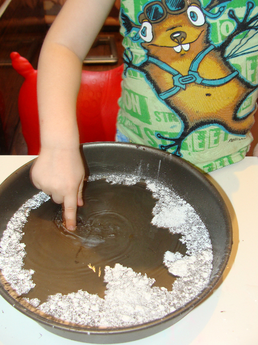 Палец окунаем в жидкость для мытья посуды или намазываем мылом. Засовываем в серединку и присыпка "разбегается" по сторонам. Весело)))