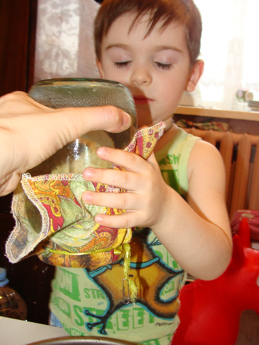 Этот опыт не самый хитрый, в банке вода, а если носовой платок хорошенько натянуть на горлышке и закрепить, вода не вытекает. А просто через платочек, который можно держать в руках,протекает. Сила натяжения. скрепка на ленточке просто так...только сейчас ее заметила)))
