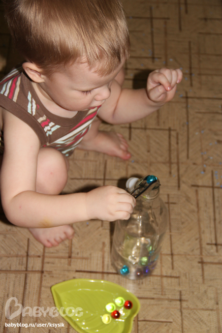 Играли с прищепками и скрепками. Пока все плохо получается, но бывает что старается!!! Будем продолжать.