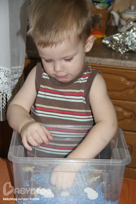 Вообще с этими недельками у меня получилась экономия. Я совсем перестала покупать игрушки!!! Пользуемся тем что находим дома, а дома у нас много что есть)))) Но в эту недельку нужно было купить хоть парочку фигурок морских обитателей и положить в сенсорную коробку. Долго думала какую же коробочку сдлать, сухую или желе? Сухая как то не очень сочетается с морем, а вот желе, были сомнения полезет ли туда мой рбенок. Было решено сделать обычное соленое море!!! Вода, соль, краситель, ракушки, звездочки и парочка морских жителей.