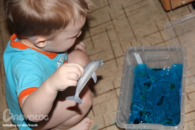 Морского льва Алешка испугался, пришлось выловить и убрать))) А вот с дельфинчиком игрался. Повторял как дельфинчик прыгал в дельфинарии. "и-и-и-и-и-и пиг" и лужа моря на полу, но зато сколько веселья!!! Это Вам не в желе ковырятся)))
