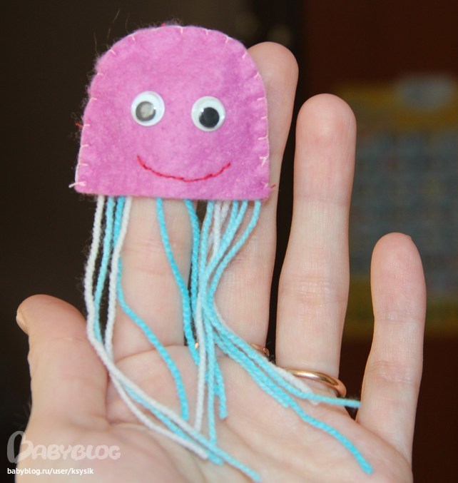 Вот такую медузка мама сшила. Иногда (очень редко) Алешка тоже ее на пальчик одевал и игрался с ней)))