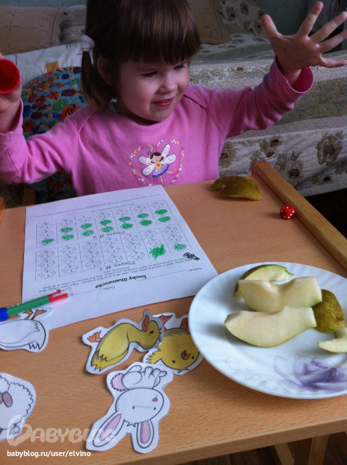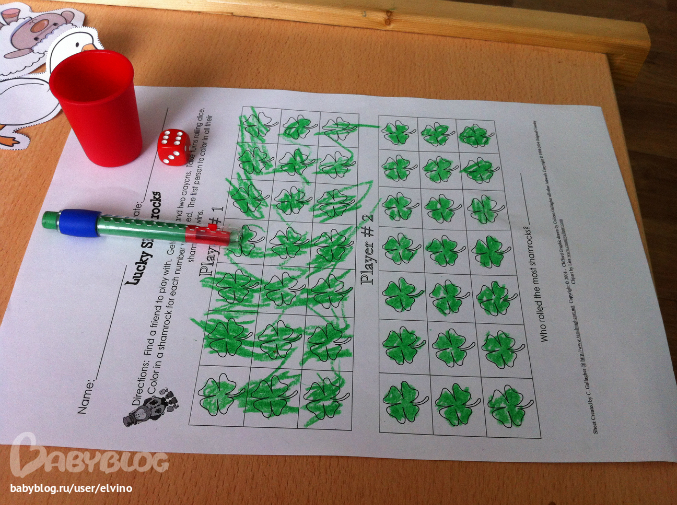 А это очень интересная игра по развитию математических навыков, счету. Для игры понадобится: игровые поля для двух игроков, в данном случае в каждом поле одинаковое количество листочков, игральная кость и карандаш. Каждый игрок по очереди бросает кость и закрашивает ровно такое количество листочков, сколько ему выпало точек. Кто первый закрасит все листочки, тот и выйграл. Считаем и закрашиваем.