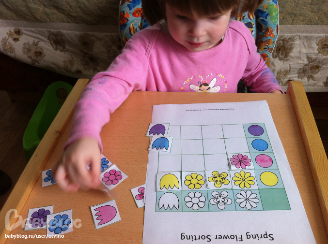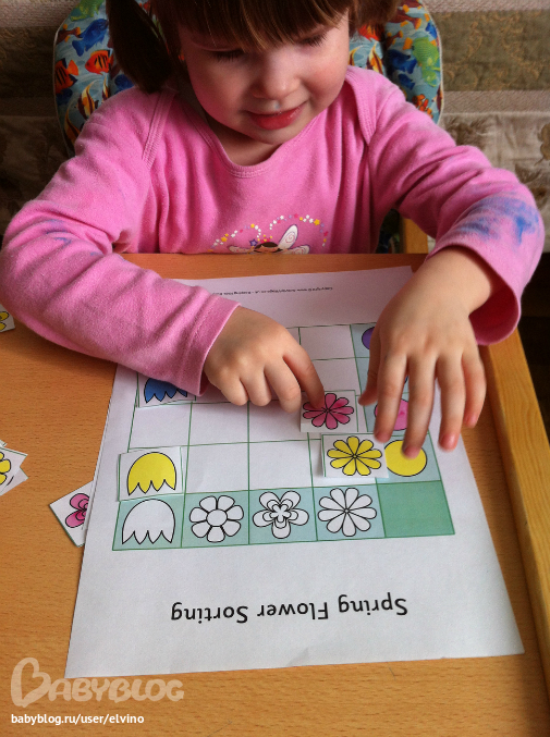 Хоть весной и не пахнет, дабы поднять настроение, я отыскала яркие занимашки с весенней тематикой. Первое "Весенняя сортировка цветов". Довольно сложное задание, так как цветы надо рассортировать одновременно и по цвету, и по виду цветка. Иногда приходилось помогать.