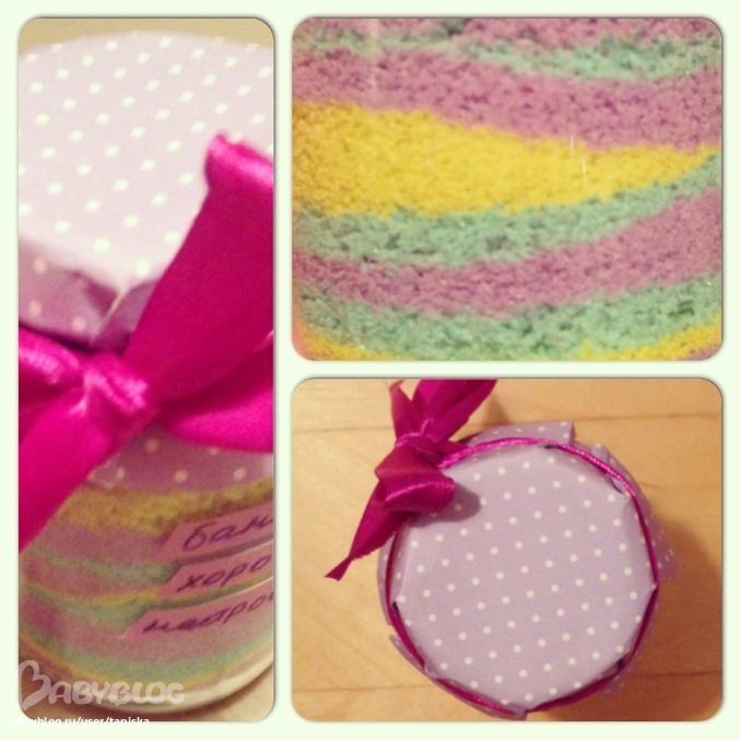Делали мы с Дишей подарок тете - баночку с цветной солью. Процесс: