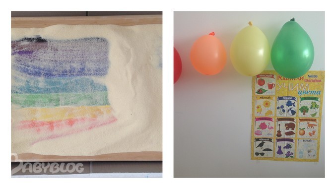 Еще были поднос с манкой и радугой и плакатик с шариками: