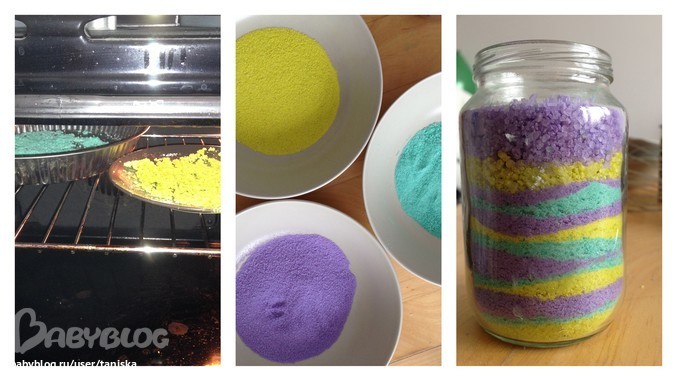 Крупную соль красили гуашью (Диана активно помогала - перемешивала), сушили в духовке при 80С и потом размельчали икеевским ситом для муки. Насыпали в баночку слоями.