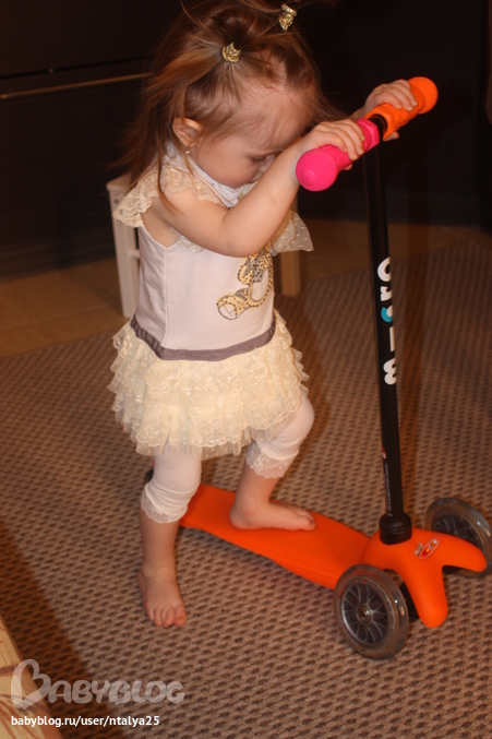 ))))Нам подарила сестра мужа)) есть у вас такая?)))Настя уже научилась отталкиваться и катиться из комнаты на кухню по длинному корридору, скоро будем рассекать в Краснодаре. к нашему лету точно научится кататься. там надо научиться равновесие держать. а Настя боится, самокат наклоняется. а ей кажется что она падает.
