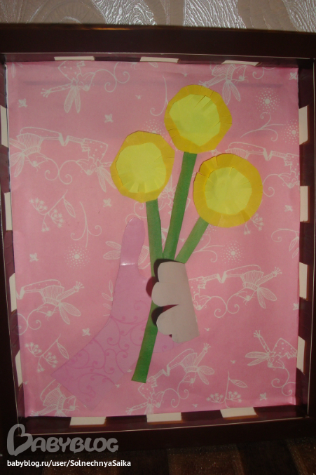 Теперь на 8 марта. 23 февраля Соня с Катей дружно затемпературили, и мы сидели дома и пропустили утренник в саду. Подарка рукодельного я от неё не ждала, так как две недели сидела она со мной дома. А они с бабушкой сделали мне сюрприз, в виде таких вот солнечных одуванчиков: