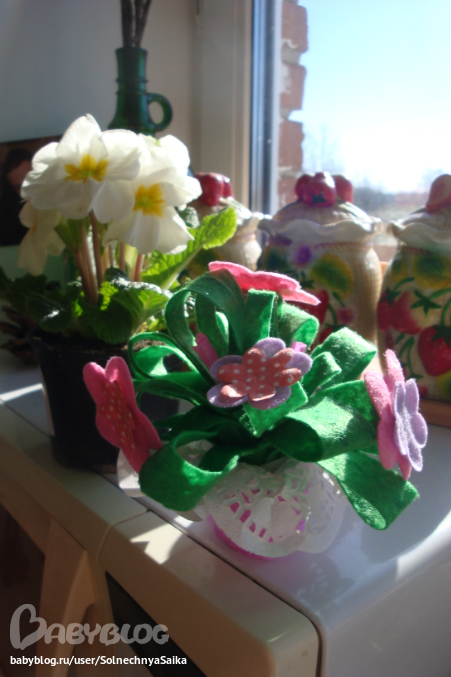 А мы бабушки сделали вот такой букет из фетра. Очень просто. Резала фетр сама, хотя было трудно, цветочки готовые, приклеивала сама. Бабули понравилось очень)