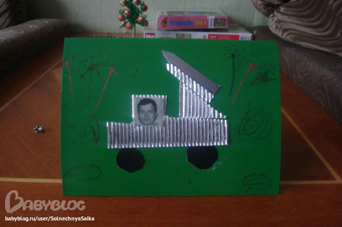 Дедушка служил в ракетных войсках, поэтому они с бабулей сделали ему "Катюшу" . Вырезала сама, приклеивала и рисовала салют, с обратной стороны написала "Поздравляю", под диктовку бабушки