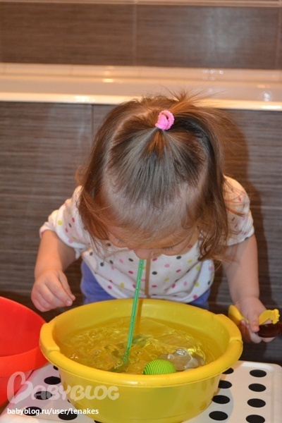 Немного позанимались дахательной гимнастикой. Подули в трубочку. Настена так смеялась, ей так понравились пузыри в воде.