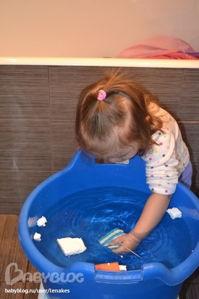 Я сделала из пенопласта и губки кораблики, пустили их в таз. Нужно было тоже дуть. Но корабли были сразу поломаны, подула совсем чуть-чуть и начала просто возиться в воде и выжимать губку.