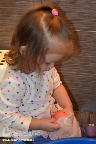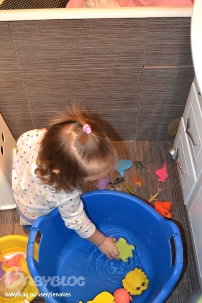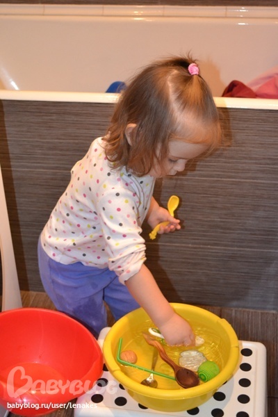 Потом мы начали проводить наш первый опыт. Узнали, что некоторые предметы тонут, а некоторые нет. Я ей чуть рассказала про плотность предметов, но думаю, что это еще рано. К этому вернемся через годик, а пока просто наслаждались игрой.