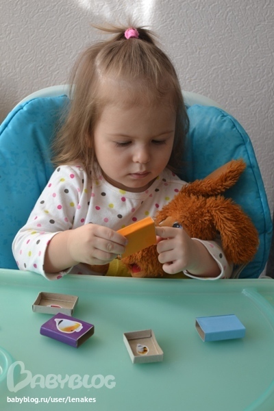 В коробочке с камешками нужно найти камни синего цвета и разложить по своим домикам. Задание понравилось.