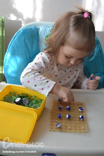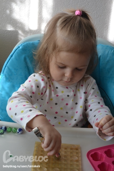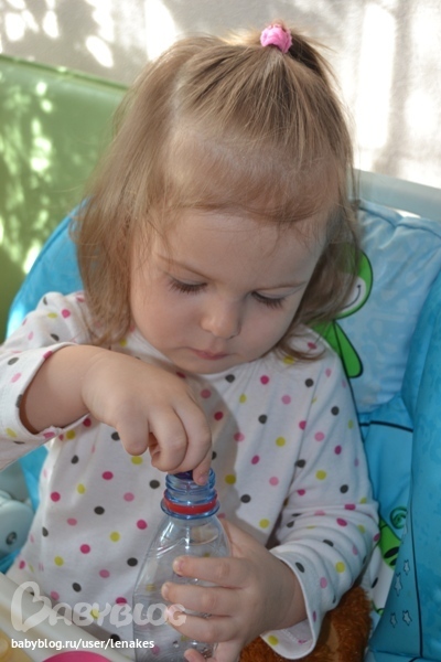 Увидев на столе бутылку, Настюшкин ее попросила и начала кидать туда шарики. Это занятие ее надолго увлекло. А я и рада, тренируем наши пальчики.