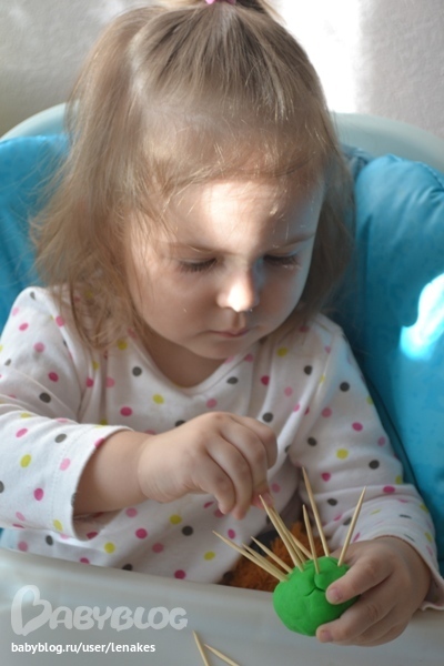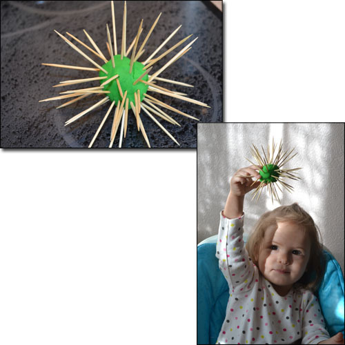Следующее задание - сделать морского ежа. Здесь и моторика и творчество сразу. Делали ну очень долго, практически все зубачистки использовали. Настене очень понравилось, постоянно прикладывала пальчик к кончику и говорила "Ой, коючий".