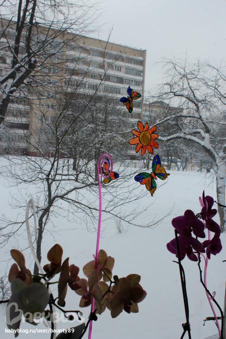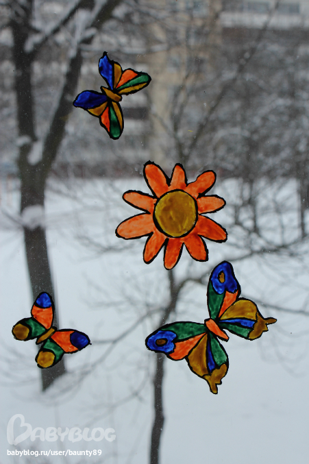 Проснувшись, увидев снегопад за окном, было решено что-то менять!! Лежал у меня неиспробованный рецепт витражных наклеек, час работы-и на наше окно прилетели бабочки!!