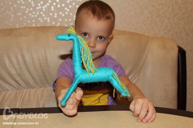 Потом я заинтересовалась, можно ли из ниток сделать еще что-нибудь эдакое, порылась в интернете и кое-что нашла. Мы соорудили лошадку из бумаги и ниток, такая забавная игрушка получилась, сын даже вечером с ней спать пошел.