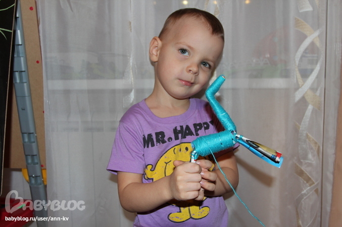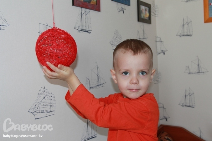 Ну и напоследок соорудили шарик-паутинку из ниток, шарика и клея. Поделка давно всем известная, но я почему-то Артёмке ни разу не делала, а зря...Столько было восторга!