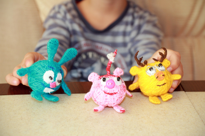 По такому же принципу что и мышь, чуть позже сделали смешариков. Вместо винной пробки - пенопласт, вырезанный в форме шара и обработанный наждачной бумагой, ну и скрепки для изготовления ручек, ножек, рожек))) Всё обматывается нитями нужного цвета, пришиваются глазки и носики, и вот что у нас получилось: