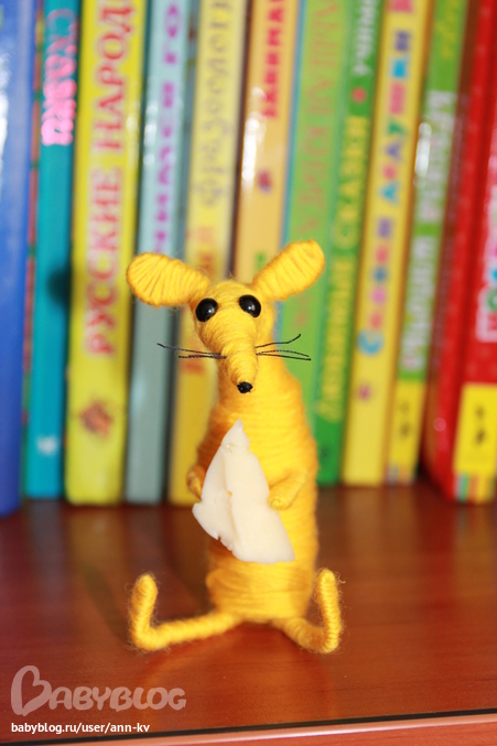 Шея и голова моделируется из ваты и клея, потом всё обматывается нитью, по хорошему бы, конечно белой или серой, но ребёнок мой настоял на том, что мышь будет желтой, так тому и быть))