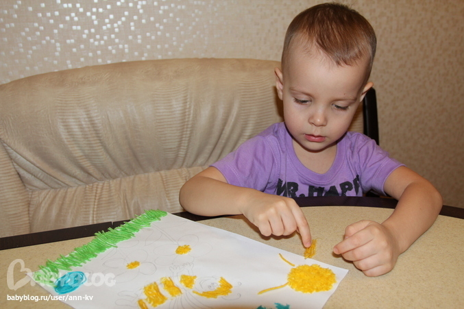 Вообще, что касается апликации, мне показалось, что нам всё же еще рановато. Травку, солнышко, облако - Артем клеил легко и с интересом, а вот с более сложными деталями приходилось помогать. К тому же мы совсем недавно начали работать с клеем, сын еще не привык, и ему не нравится, когда пачкаются руки, по этой причине мы совсем не любим пальчиковые краски...