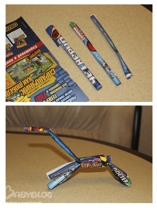 Нужно скрутить три трубочки из журнала или газеты, потом собрать их так, чтобы две трубочки - были ногами, одна шея и голова, скрепить это еще одним листом бумаги. Всю несложную конструкцию можно скрепить клеем или нитками.
