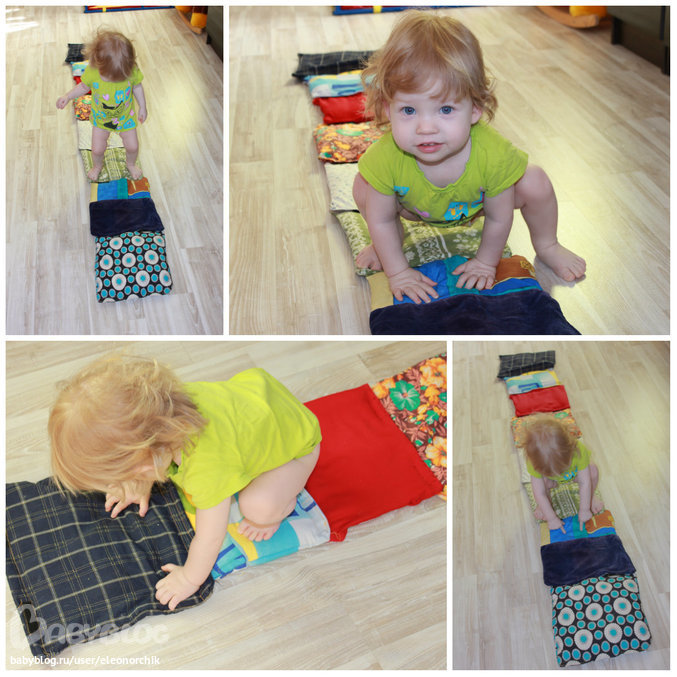 Ходить по ним не так уж и просто. Доча всегда такая сосредаточенная, ведь тут вам не ровный паркет. :)) Тут еще равновесиу нужно дерать. Первое время Леру было не согнать с дорожки, она и ходила и ползала по ней. И ручками мешочки трогала. Сейчас немного подостыла, ее место занял наш кот который балдеет от мешочка с шариками так как они очень громко хрустят. :)