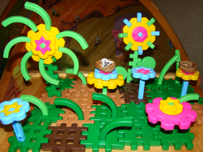 3. Птичка Колибри. Для птички колибри делали полянку с цветами, гнездышко из скорлупки ореха (прочитала, что гнездышко колибри имеет размер ореховой скорлупки) и угощали ее нектаром.
