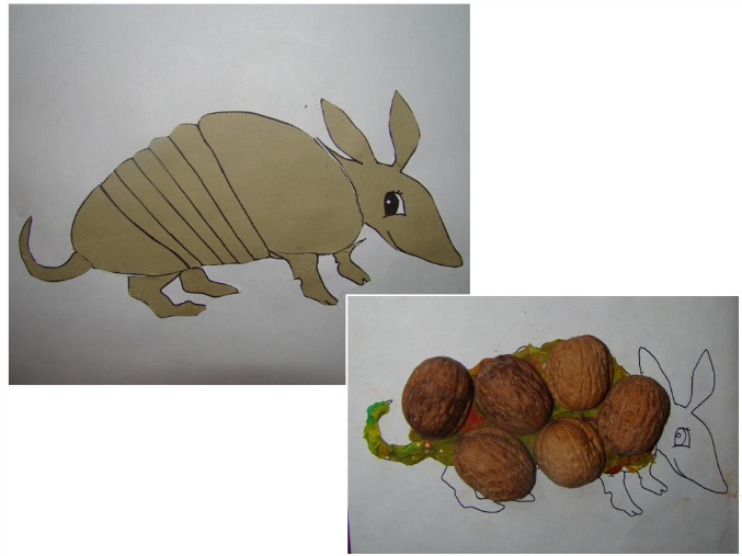 2) Броненосец (аппликация, а также делали броню из скорлупок ореха):