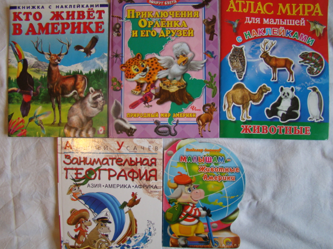 3) Вклеивали наклейки с животными в Атлас мира для малышей. Собирали постер из картинок – наклеек в книге "Кто живет в Америке" Однако эта книжка посвящена северной и южной америки, поэтому собрали только половину: