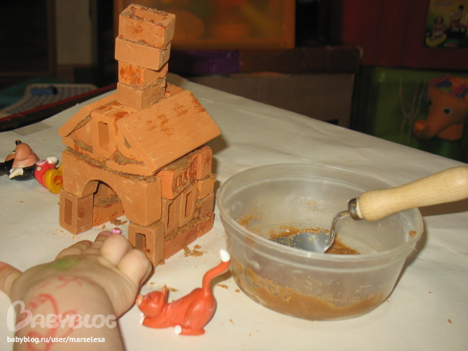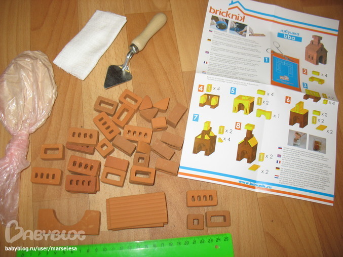 Кирпичики, смесь сухая (речной песок и крахмал), салфетка, мастерок
