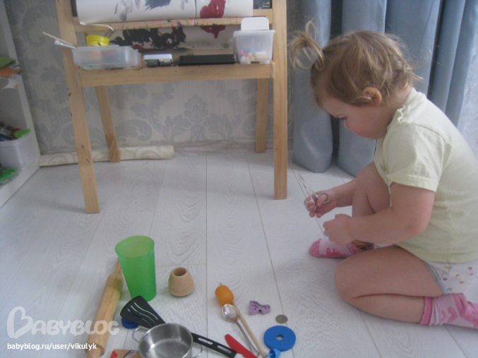 Еще решила уточнить, понимает ли Соня, что предметы бывают из разного материала. Выяснилось, что часть предметов ей понятна (например, когда это деревянная скалка или палочка), а вот цветная бусина фиолетового цвета уже вызывает противоречия. Не сразу поняла, что она деревянная. Понадобились наводяшие вопросы. Про металлические предметы ей тоже, видимо, было понятно, только потому, что они все были серебряные. Я объяснила, что металл всегда ходолдные, ну или просто намного холоднее других предметов из нашей кучки. В конце уже уверенно называла, что из пластмасы, что из дерева, а что из металла. Думаю, ей было интересно. Раньше я ей как-то на это специально внимание на заостряла, говорила про все мимоходом, поэтому в таких занятиях есть большая польза.