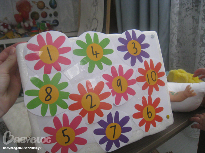 Есть цифры, которые Сонечка уже запомнила и легко находит, но все равно большую часть я ей подсказываю. Цифры с ней пока специально не учим, только счет.