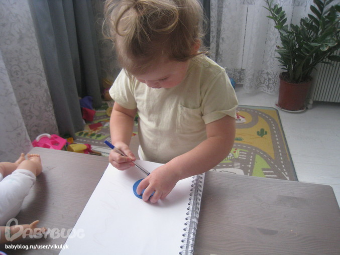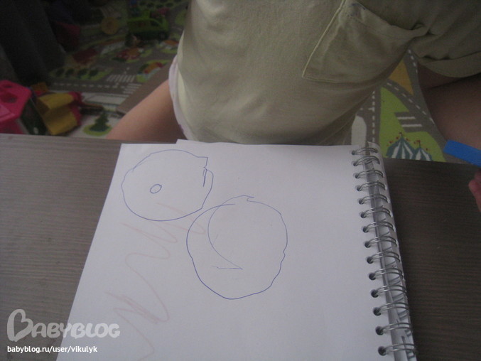 Потом предложила обвести круг. Вышло забавно! Еще не очень понимает, что его надо бы придерживать, чтобы точно такой же круг сделать. Поэтому получились круги собственного производства!