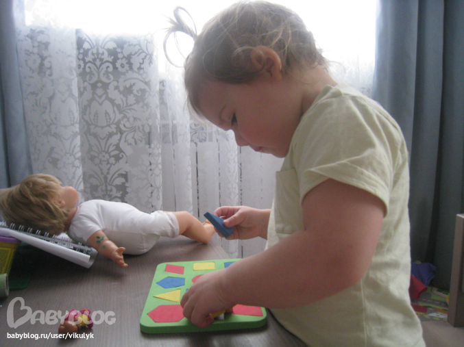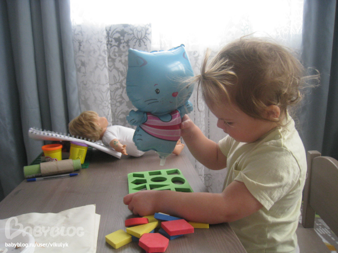 Затем предложила вспомнить ей про рамку с фигурами и пособирать. Энтузиазма было немного. Пришел кот-шарик и стал прыгать по отверстиям рамки. Вот это очень интересно! Так решила Соня. Но позже все же решила, что можно и пособирать рамку.