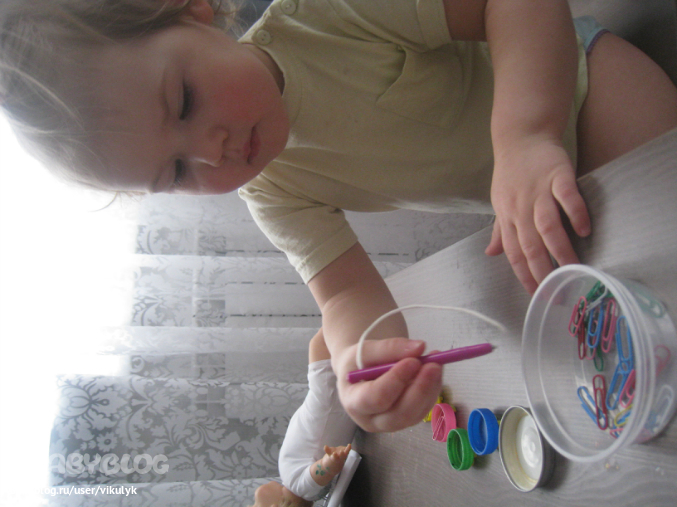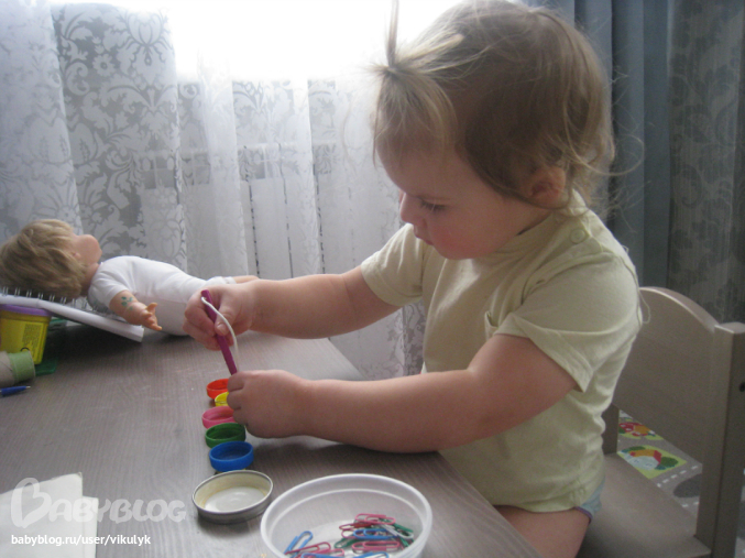 Потом сортировали скрепки и раскладывали их в маленькие крышечки соответствующего цвета с помощью магнитной палочки. Под конец все-таки решила все делать руками. Решила, что так быстрее. Обратила внимание, что это штампики и решила, что ей срочно нужно порисовать.