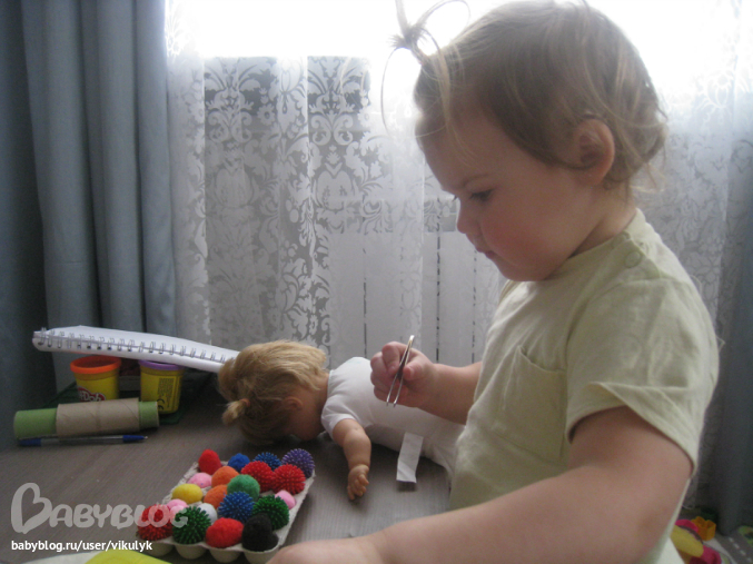 Дальше решили вспомнить про пинцет и расложить наши шарики-помпоны и колючие шарики по ячейкам из-под коробки от перепелиных яйц. Это Сонечка очень любит.