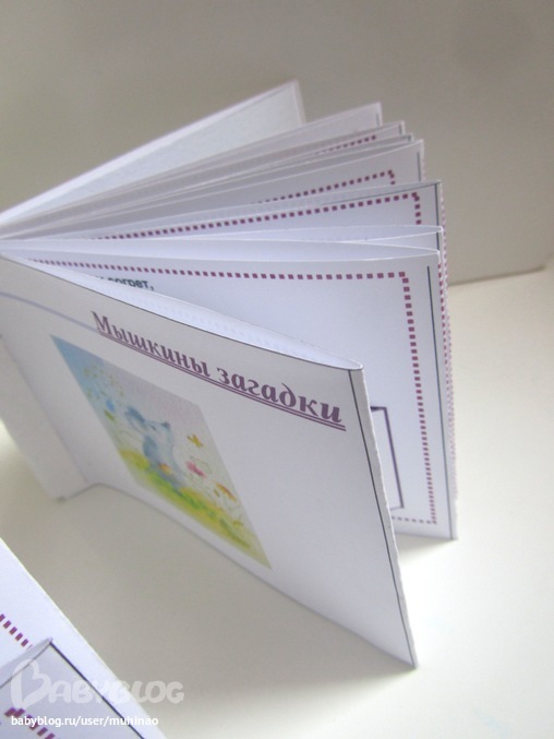 Размер книжки 15*10, это лист формата А4 разрезанный вдоль и потом согнутый пополам. Книга прошита, можно сделать на кольцах или просто продыроколить.В каждой книжечке 6 загадок, т.е. 5 разворотов