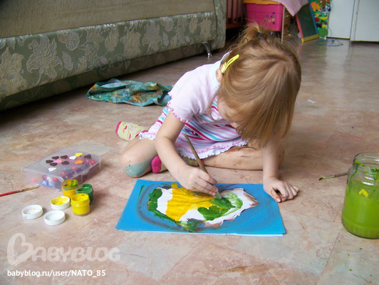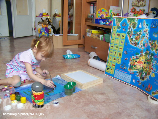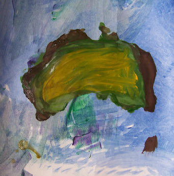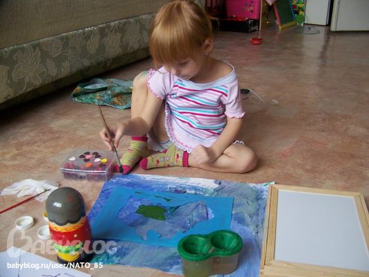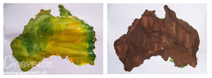 В качестве творческой части выбрали лепку и рисование, причем не просто так, а материк Австралия) На скорую руку вырезала из обложки от папки контур материка и дала краски ребенку.