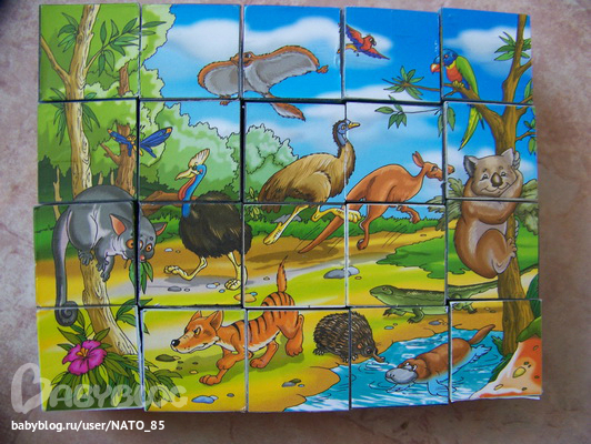 Откопали у себя в закромах набор кубиков с картинками-историями. Складывали Австралийскую часть и находили животных и придумывали рассказы о их жизни!